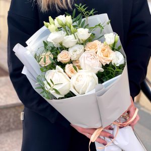Букет из нерине, пионовидных роз Бомбастик и махровых лизиантусов